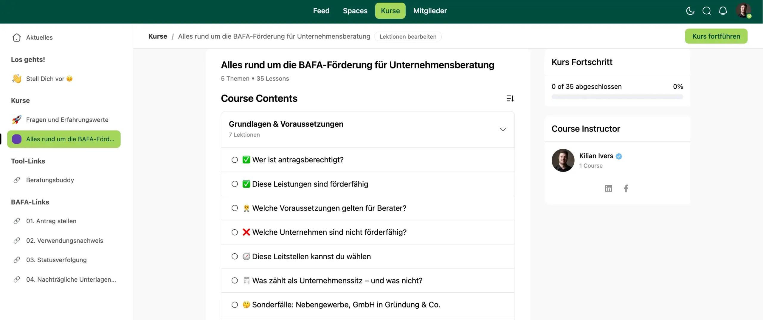 Ich habe mich schon über einem Jahr mit Fördermittel und Zuschüssen beschäftigt, um meine Dienstleistung für meine Kunden attraktiver gestalten zu können. Im Alleingang habe ich mich immer wieder im Papierkram verirrt und das ganze links liegen gelassen. Dann kam ich zufällig auf Kilian - ein kurzes Gespräch, meine Unterlagen eingereicht und innerhalb von 4 Tagen war ich gelisteter BAFA-Berater! Bisher sind 3 Wochen vergangen und ich habe jetzt schon ein ROI von 13!!! Vergeudet keine Zeit indem ihr versucht es selber zu schaffen - ohne einen 1:1 Partner wie Kilian wird es nichts. Klare Empfehlung.